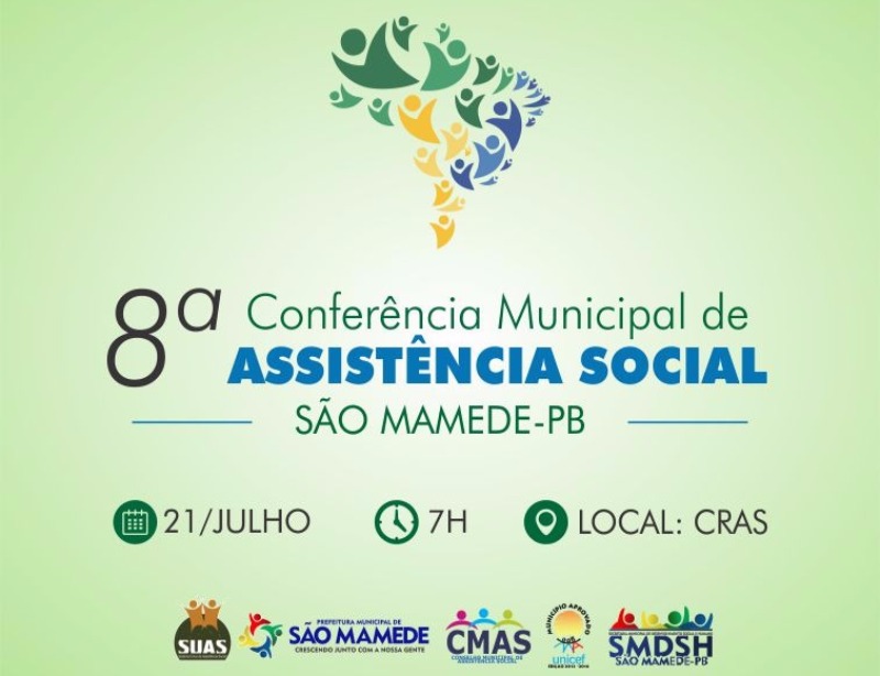O Conselho Municipal de Assistência Social - CMAS, juntamente com a Prefeitura Municipal de São Mamede, através da Secretaria Municipal de Desenvolvimento Social e Humano, realiza amanhã (21/07) a 8ª Conferência Municipal de Assistência Social, a partir das 7h00 na Sala dos Conselhos do CRAS.
