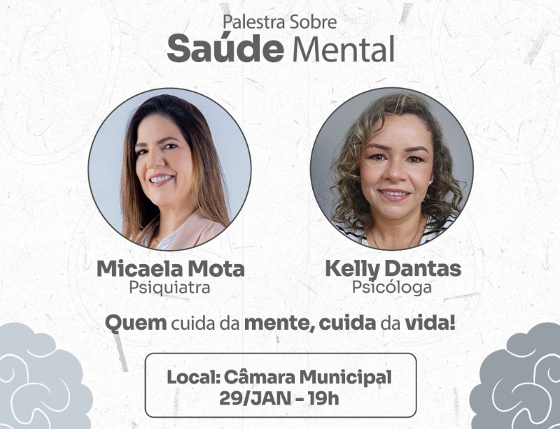 O evento, que será aberto ao público, acontece na Câmara de Vereadores do município, a partir das 19h, com a participação da psiquiatra Micaela Mota e da psicóloga Kelly Dantas.