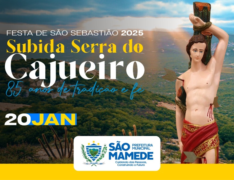 A Prefeitura de São Mamede, por meio da secretaria de Cultura e Artes, já se prepara para a tradicional “Subida da Serra do Cajueiro”, no sítio Saco de Serra Branca, no próximo 20 de janeiro, Dia de São Sebastião. Com o slogan “85 anos de Tradição e Fé”, a secretaria pretende atrair mais visitantes, pagadores de promessa, promover o turismo religioso, ecológico e de aventura na natureza.