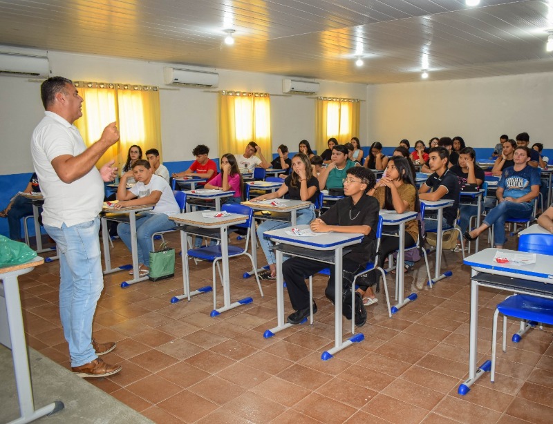 Essa ação ocorreu na Escola Marina Gouveia com o professor João Henrique Candeia, que deu início às aulas nas turmas do 9º ano.
